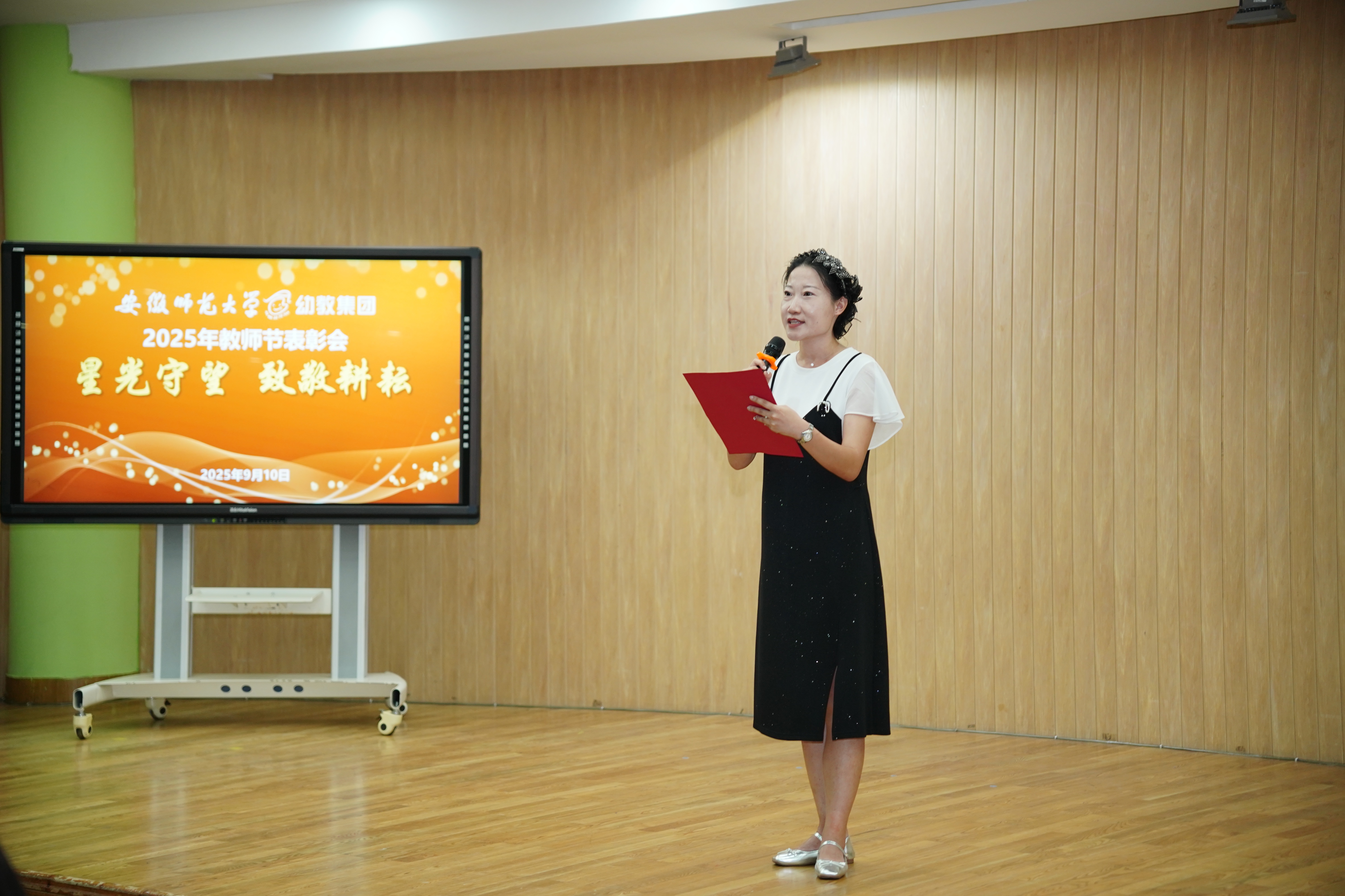 为弘扬尊师重教的优良传统,激发全体教职工的工作热情和职业荣誉感。9月10日上午,幼儿园在一楼多功能厅以“星光守望,致敬耕耘”为主题组织开展了荣誉表彰会。表彰会上对荣获区级以上优秀教师、教育工作者、班主任及2024年度考核优秀人员进行了表彰。荣获安徽省自制玩教具能手称号的优秀教师束磊作为代表,结合自身教育工作实践,深情分享了自己的育人故事,她的讲述,如同一束光,照亮了教育之路上的点点滴滴,让在场的每一位老师都深受启发和感动。