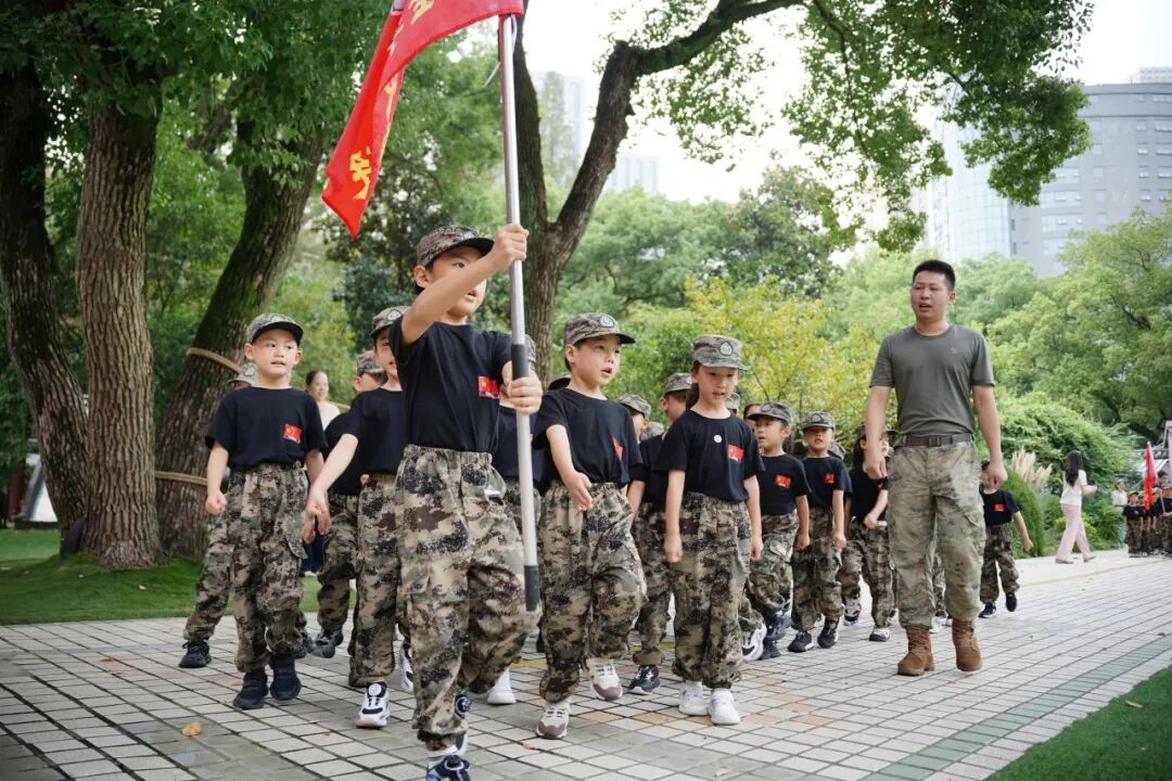 活动在庄严的升旗仪式中正式拉开帷幕。伴随着雄壮的国歌声,身着迷彩服的小小兵们精神抖擞,列队入场。教官们以标准的军姿和整齐划一的队列动作为孩子们进行了风采展示,瞬间点燃了孩子们对军旅生活的向往与崇敬之情。在随后举行的授旗环节中,各班教官郑重接过队旗,标志着为期五天的“小小兵”体验活动全面启动。