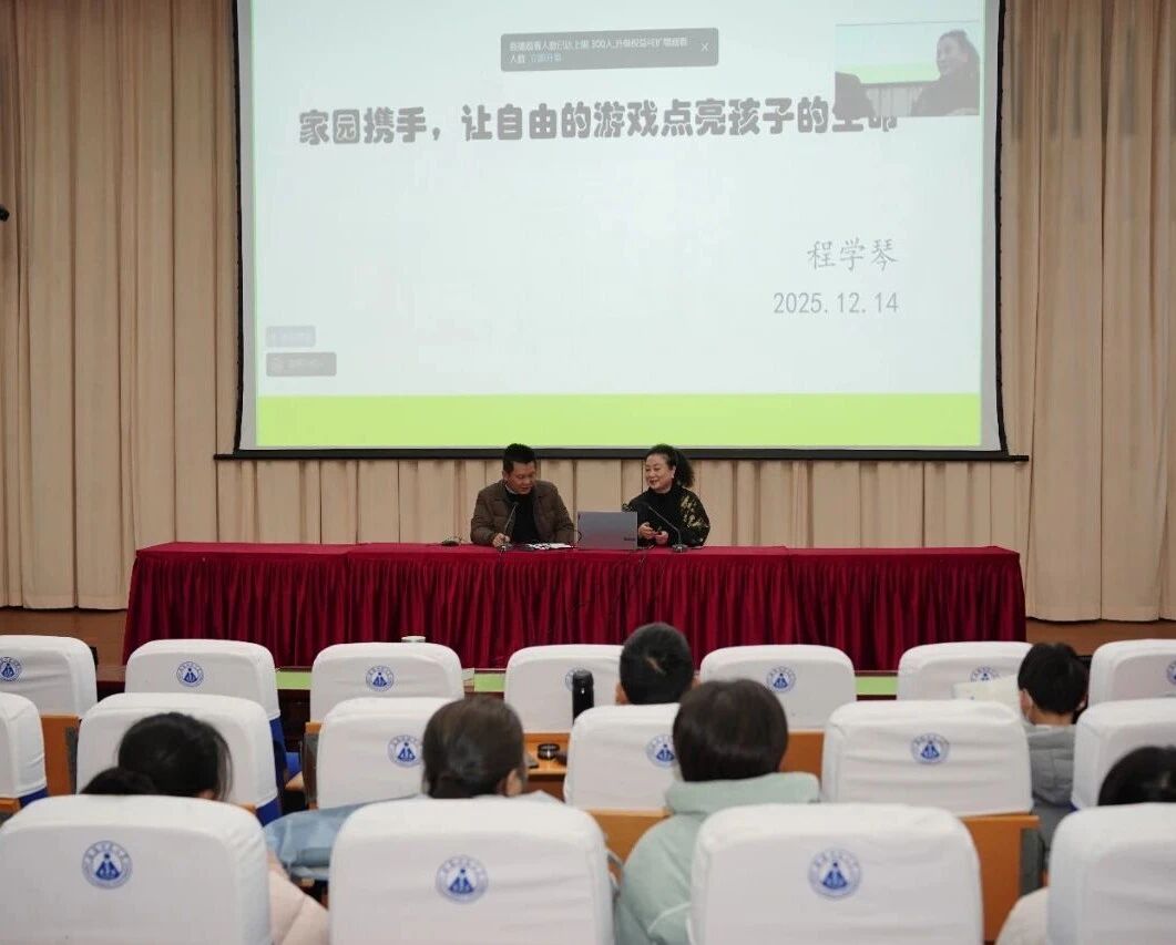 12月14日上午,安徽师范大学幼教集团特邀“安吉游戏”创始人、世界真游戏联盟发起人程学琴老师,开展题为《家园携手,让自由的游戏点亮孩子的生命》的专题讲座。活动由集团王路曦园长主持,采取线上线下相结合的方式,现场参与家长逾200人,线上直播观看人数突破1600人。