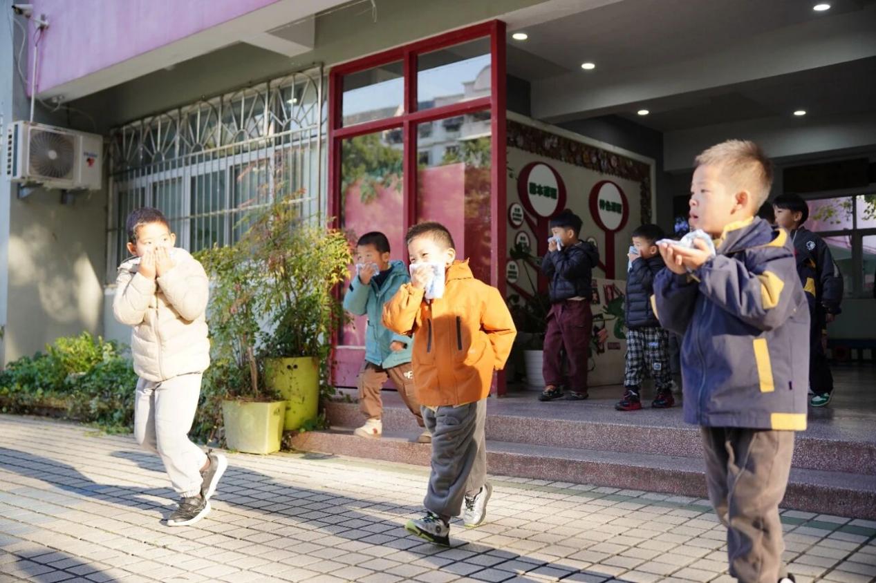 下午3时10分,消防警报响起,演练正式开始。各班教师迅速引导幼儿用湿毛巾捂住口鼻,采取弯腰低姿,沿预定疏散路线有序撤离。过程中,教师沉着冷静、分工明确,前中后三位老师分别负责引路、情绪安抚与后方保障,确保不落下一名幼儿。 在各楼梯口、通道等关键位置,疏散指挥组教师不断提醒:“注意脚下,不要推挤!”孩子们在引导下迅速、安静地撤离至操场安全区域。整个疏散过程紧张而不慌乱,仅用时3分钟,全体师生均安全到达指定集结地点。